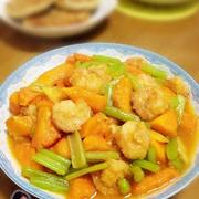 木瓜、虾仁、芹菜、鸡蛋、淀粉、花生油、盐、味精、白糖、葱姜油、料酒。