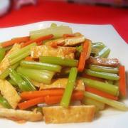 芹菜、胡萝卜、炸豆腐、葱、姜、蒜、花生油、盐、调味酱油、白糖、味精、香油。