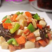 胡萝卜、山药、青椒、火腿肠、莲藕、葱、姜、蒜、花生油、盐、生抽、白糖、味精、香油。
