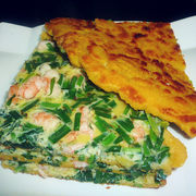 玉米面、白面、韭菜、鸡蛋、虾仁。