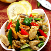 鲍螺肉、柠檬、青红美人椒、大葱、香菜、生抽、盐、鱼露、香醋、香油。