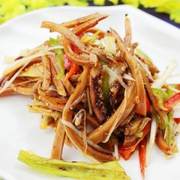 干鱿鱼、葱丝、青红椒丝加入盐、味精、辣椒油、蚝油。