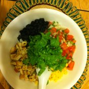 西红柿、洋葱、米饭、Jalapeno、香菜、青柠、蒜头、鸡胸肉或是黑豆、甜玉米。