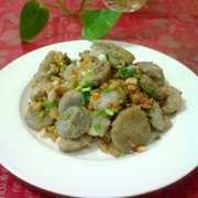 肥猪肉、胡萝卜、毛芋、香葱、蒜瓣、糖、盐、椒盐、味精。