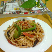 面条、火腿肠、洋葱、青椒、胡萝卜、香菇、糖、盐、鲜味生抽、老抽。
