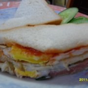 白土司、鸡蛋、火腿肠、青瓜、番茄酱、沙拉酱。