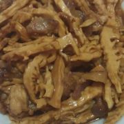 五花肉、四川豆杆、料酒、生粉、生抽、茴香、胡萝卜、老抽、食盐、生姜、蒜苗。