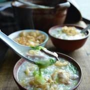 米、粉肠、瘦肉、腐竹、猪肝、生菜、瑶柱、油条、盐、蚝油。