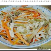 胡萝卜、鸡脯肉、榨菜、绿豆芽、葱、姜、盐、生抽、胡椒粉、鸡精、白糖、料酒、油。
