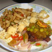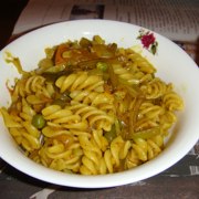 牛肉、洋葱、青红椒、蒜、虾、通心粉、甜豆、黑胡椒粉、盐、咖喱粉、生抽、意大利什锦香料。