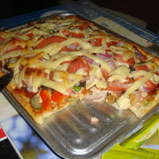面粉、酸小黄瓜、黑橄榄、番茄、甜辣酱、橄榄油、青椒、红椒、马苏里拉芝士、杏鲍菇、熏肠、洋葱、蟹钳肉、甜虾。