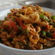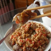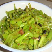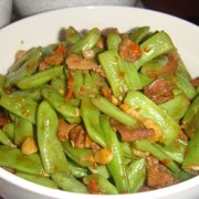 四季豆、猪肉、盐、料酒、生粉、酱油、干辣椒粉、蒜。
