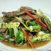 青蒜、腰子、葱、姜若干、红椒、盐、油、酱油、料酒、糖。