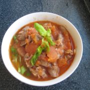 肥牛片、西红柿、洋葱、芹菜嫩叶、面条、蕃茄酱。