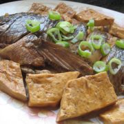 罗非鱼、豆腐、葱、大料、料酒、油、姜、蒜、老抽、盐、糖。