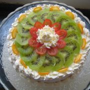低筋粉、鸡蛋、牛奶、色拉油、糖、奶油、泡打粉、白醋、猕猴桃、金桔、圣女果、火龙果。