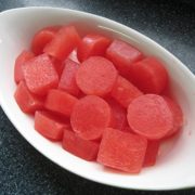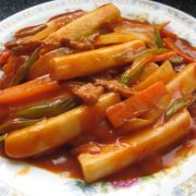 火锅年糕、胡萝卜、洋葱、芹菜、瘦肉、韩国辣椒酱、蕃茄酱、盐。