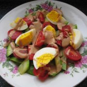 小西葫芦、小西红柿、鸡蛋、亨式蕃茄酱、沙拉酱、芝麻酱、酸奶、盐。
