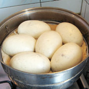 高筋面粉、鸡蛋、南瓜泥、白糖、鲜奶油、酵母、盐、沙拉酱、肉松、白芝麻、蛋液、蒜苗。