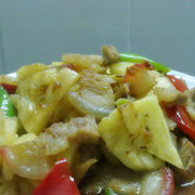 菠萝、五花肉、青椒、红椒、蒜、盐、鸡精、生抽、糖。