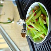 黄鳝、豆腐、海米、黄花、木耳、葱、香菜。