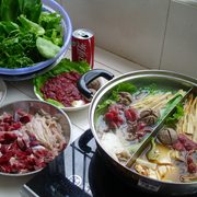 猪腿骨、牛肉、牛肉丸、鸡肾、鸭肾、鸡肠、鸭肠、白萝卜、莲子、腐竹、生菜、西洋菜、水豆腐、姜、盐、老干妈、花椒粉、调和油。