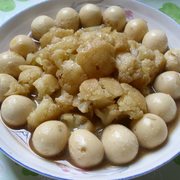 菜花、鹌鹑蛋、蒜头、盐、酱油、调和油。