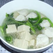 冻豆腐、鱼丸、油炸蒜子、小油菜。