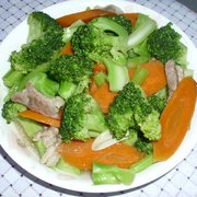 西兰花、胡萝卜、小油菜梗、瘦肉、蒜头、盐、调和油。