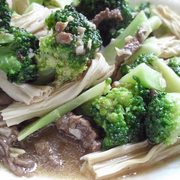 西兰花、腐竹、牛肉、蒜蓉、酱料、酱油、盐、调和油、水淀粉。