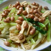 花生米、腐竹、西芹、盐、味精、酱油、白醋、橄榄油。