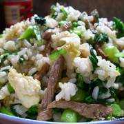 鲜饭、油菜、瘦肉丝、鸡蛋、调和油、盐、酱油。