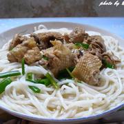 鸡肉、过桥米线、葱、酱油、盐。