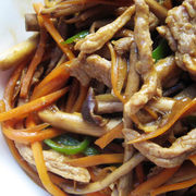 瘦肉、茶树菇、胡萝卜、青椒、干红椒、豆瓣酱、油、盐、料酒、生抽。