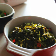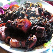 梅干菜、五花肉、姜、料酒、盐、冰糖、老抽、酱油、八角、桂皮、香叶。