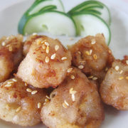 鸡腿肉、熟芝麻、底筋面粉、玉米粉、清水、酱油、米酒、鸡精粉、姜泥、盐、麻油。