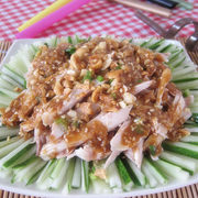 鸡腿、青瓜、青葱、花生碎、芝麻酱、酱油、白醋、白糖、麻油、清水、蒜,姜末、辣椒油、熟白芝麻。