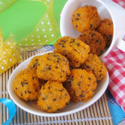 梅花肉、红萝卜、香菇、葱白、黑芝麻、橙色面包糠、生姜、鸡蛋、水淀粉、烤肉酱、生抽。