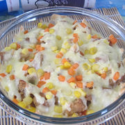 鸡腿、起司粉、马苏里拉芝士、酥炸粉、红萝卜、玉米粒、烤肉酱。