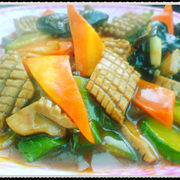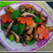 小竹轮、鱿鱼、胡萝卜、甜椒、元葱、料酒、十三香、酱油、盐、鸡精。