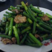 蒜苔、肉、盐、鸡精、十三香粉、海鲜酱油、葱、姜。