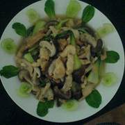 鸡胸肉、香茹、油菜、大蒜、淀粉、油。