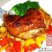 鸡腿、cook100烤肉料、料酒、盐、淡酱油、红椒、黄椒、小青菜、洋葱。
