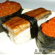飞鱼籽、鳗鱼、三文鱼籽、米饭、海苔、青芥末。