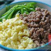 肉糜、荷兰豆、鸡蛋、盐、料酒、生抽。