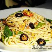大蒜、大闸蟹、黑橄榄、荷兰豆、橄榄油、意面、盐、白葡萄酒。