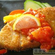 银鳕鱼、彩椒、盐、黑胡椒、生粉、蛋液、面包糠、黄瓜、番茄酱、柠檬。