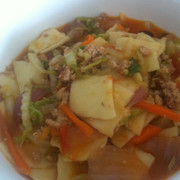 面粉、洋葱、大白菜、西红柿、胡萝卜、鲜香菇、五花肉、小葱、盐、酱油、番茄酱。