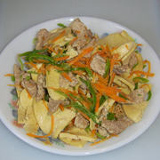 里脊、素鸡、青椒、胡萝卜、油、盐、五香粉、料酒。