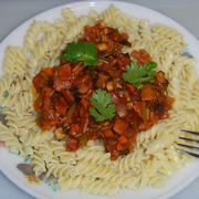 意面、培根、蘑菇、胡萝卜、洋葱、香菜、番茄酱、黑胡椒粉、干罗勒、盐。